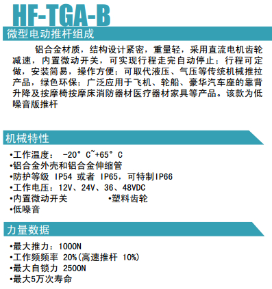 鋁合金材質(zhì),結(jié)構(gòu)設(shè)計(jì)緊密,重量輕,采用直流電機(jī)齒輪減速,內(nèi)置微動(dòng)開(kāi)關(guān),可實(shí)現(xiàn)行程走完自動(dòng)停止;行程可定做,安裝簡(jiǎn)易,操作方便;可取代液壓、氣壓等傳統(tǒng)機(jī)械推拉產(chǎn)品,綠色環(huán)保;廣泛應(yīng)用于飛機(jī)、輪船、豪華汽車座的靠背升降及按摩椅按摩床消防器材醫(yī)療器材家具等產(chǎn)品。該款為低噪音版推桿