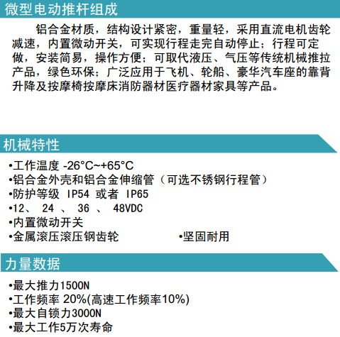 鋁合金材質(zhì),結(jié)構(gòu)設(shè)計(jì)緊密,重量輕,采用直流電機(jī)齒輪減速,內(nèi)置微動(dòng)開(kāi)關(guān),可實(shí)現(xiàn)行程走完自動(dòng)停止;行程可定做,安裝簡(jiǎn)易,操作方便;可取代液壓、氣壓等傳統(tǒng)機(jī)械推拉產(chǎn)品,綠色環(huán)保;廣泛應(yīng)用于飛機(jī)、輪船、豪華汽車(chē)座的靠背升降及按摩椅按摩床消防器材醫(yī)療器材家具等產(chǎn)品。