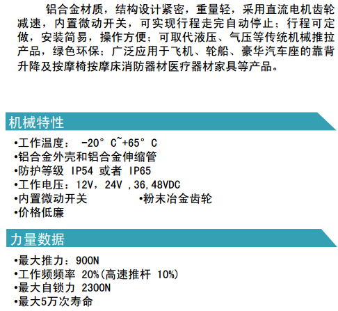 鋁合金材質(zhì),結(jié)構(gòu)設(shè)計(jì)緊密,重量輕,采用直流電機(jī)齒輪 減速,內(nèi)置微動(dòng)開關(guān),可實(shí)現(xiàn)行程走完自動(dòng)停止;